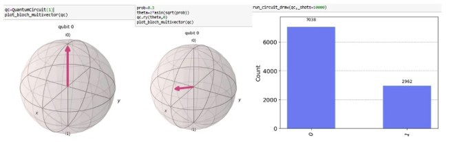 Зураг 2-ын зүүн гар талын эхний хэсэг бол ямар ч хувиргалт хийгдээгүй байх үеийн квант битийн анхны төлөв буюу хойд туйлд байрлах ∣0⟩ төлөв. Дунд хэсэгт 0.3 гэсэн магадлалыг хэрхэн кодолж байгааг харуулсан ба дээр дурдсан тригонометрийн хамаарлыг ашиглан y-тэнхлэгийн дагуу эргүүлэх үйлдэл хийсэн (x-тэнхлэгээр эргүүлэх ч мөн боломжтой). Эцэст нь, квант битийг 10,000 удаа хэмжсэний үр дүнд үүсэх магадлалын тархалтыг харууллаа. Үүний үр дүнд ∣1⟩ төлөв ажиглагдах магадлал ойролцоогоор 30% болж байгаа нь бидний кодолсон утгатай нийцэж байна.