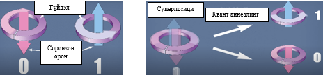 1. Кубит нь суперпозици (0 ба 1) төлөвт байх бөгөөд тус бүрийг харгалзах соронзон оронтай байхаар кодолно. Аннеалинг хийгдсэний эцэст кубит бүр 0 эсвэл 1 гэсэн уламжлалт бит хэлбэрт шилжих болно.